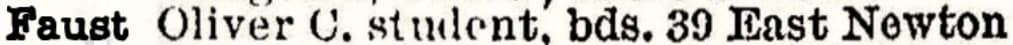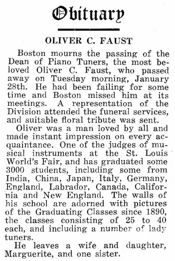 Oliver C. Faust “Teacher at New England Conservatory, and Faust School of Piano Tuning. 1937 Boston City Directory.