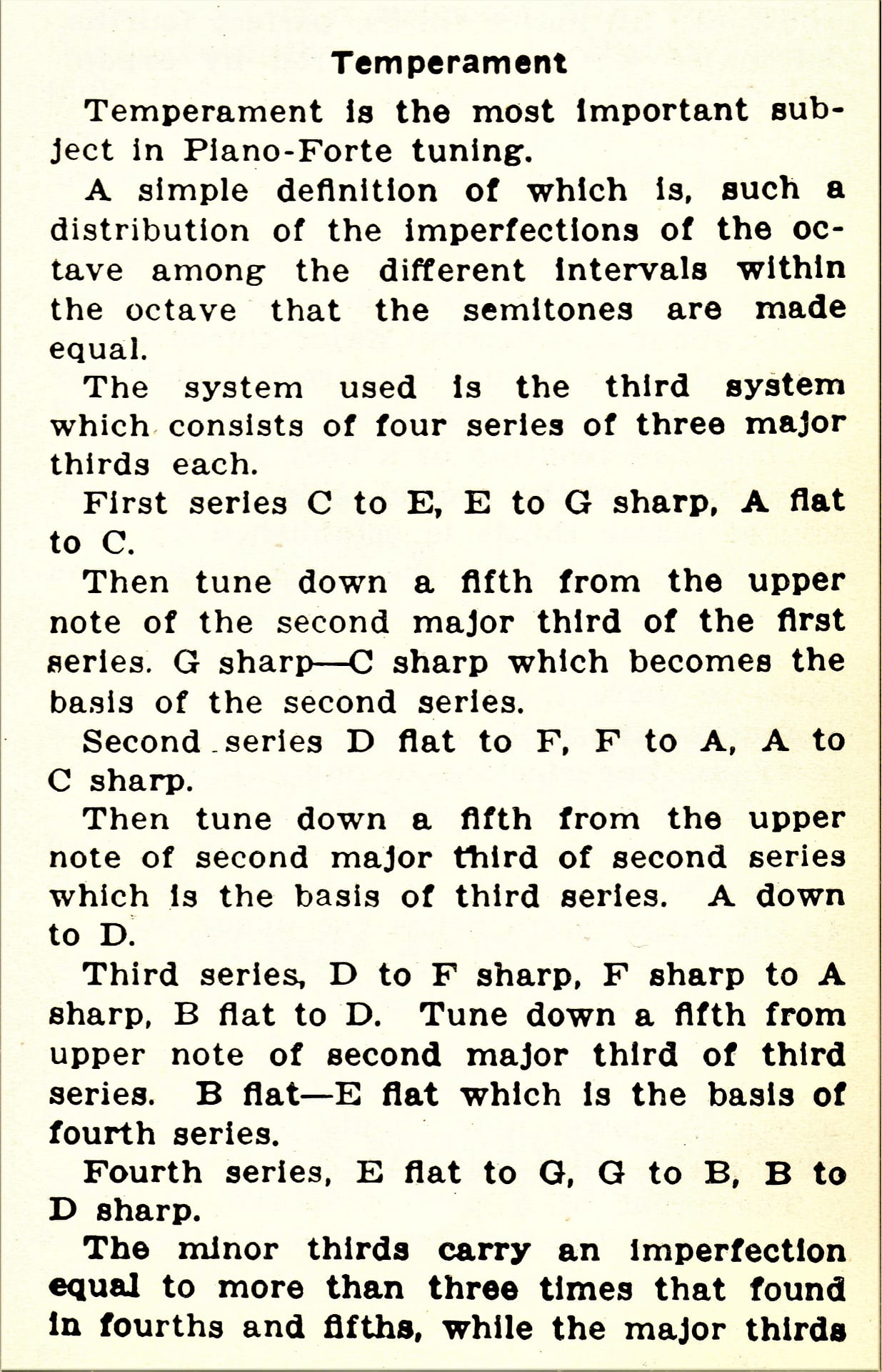 Hill and Brown gave credit to Bonifazio Asioli for the Tenor C Temperament: “The following is the Italian method, which we take from the Piano-Forte School of B. Asioli.” Most likely, a piano tuner from Italy brought this temperament pattern to the Boston area in the 1840s or 1850s. It should be noted that the actual mid-19th century results of the Tenor C Temperament, in practice with period instruments, would not have been the accurate equal temperament that we have become accustomed to today.