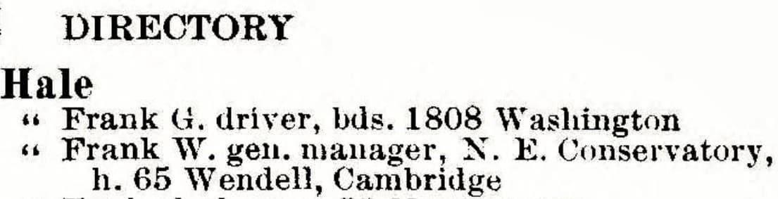 Hale listed himself as a teacher at NEC from 1882 to 1890 in the Boston City Directories. From 1892 until at least 1903, Hale was listed as the “General Manager of NEC. ” NEC moved from Franklin Square to Huntington Ave in 1902-1903