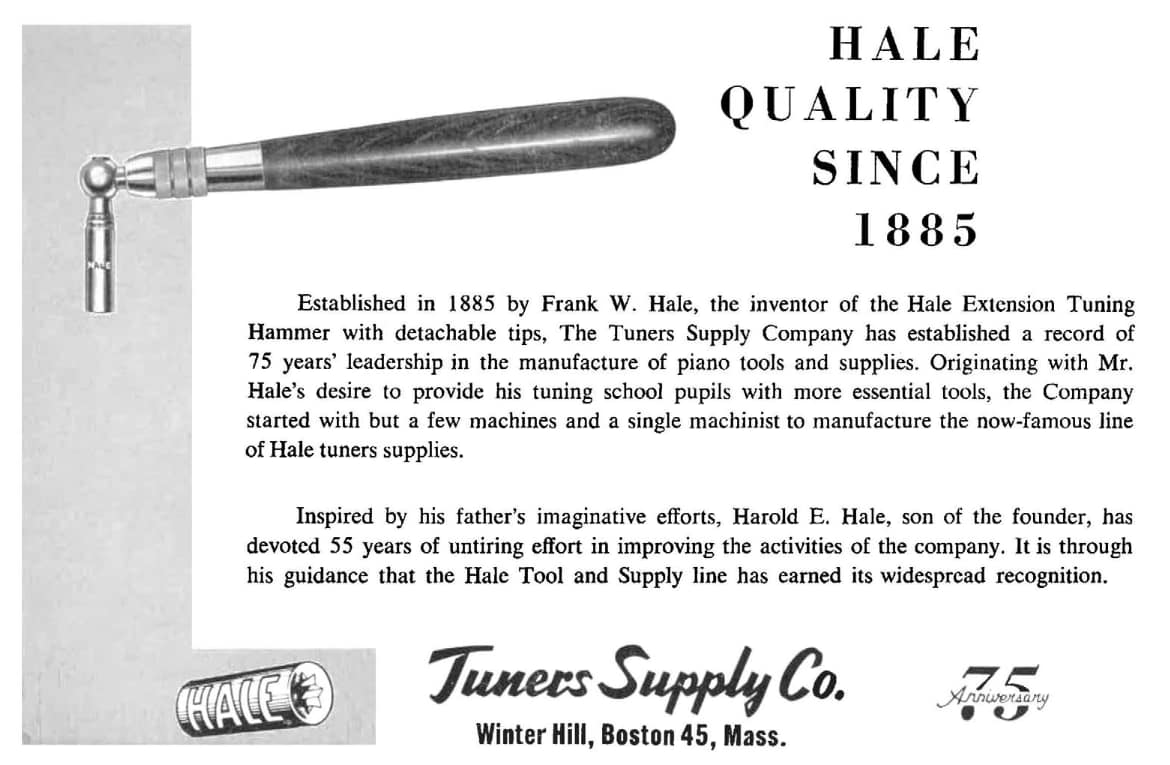 Hale advertisement in “The Piano Technicians Journal,” October, 1960. This 1960 Hale advertisement briefly described the early days of Frank Hale’s toolmaking at New England Conservatory. And it gave credit to Harold Emerson Hale (1889–1972)–inventor of the 1915 patent cup joint tuning hammer–55 years of dedicated service to Hale Tuners’ Supply Company.