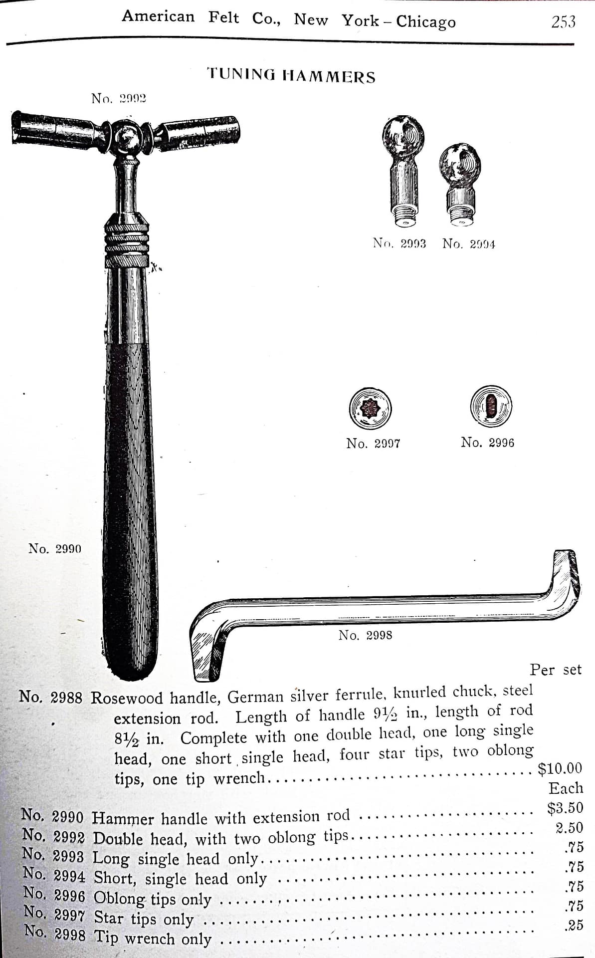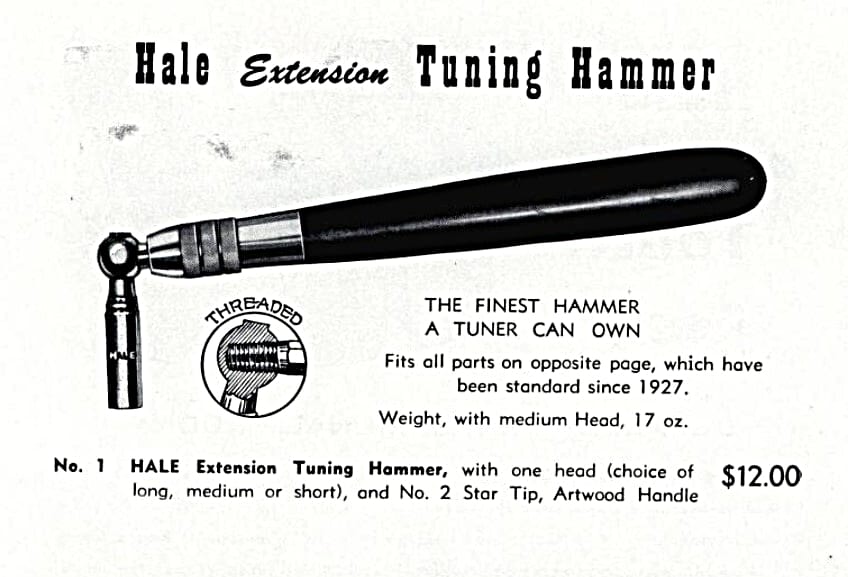 “In 1885, Frank W. Hale, then a teacher of Piano Tuning in the New England Conservatory of Music, was granted the first patent on an extension hammer with detachable tips. Since that time improvements have been made to keep this tool the leader and today is is known throughout the world as the most practical tuning hammer a tuner can own.”