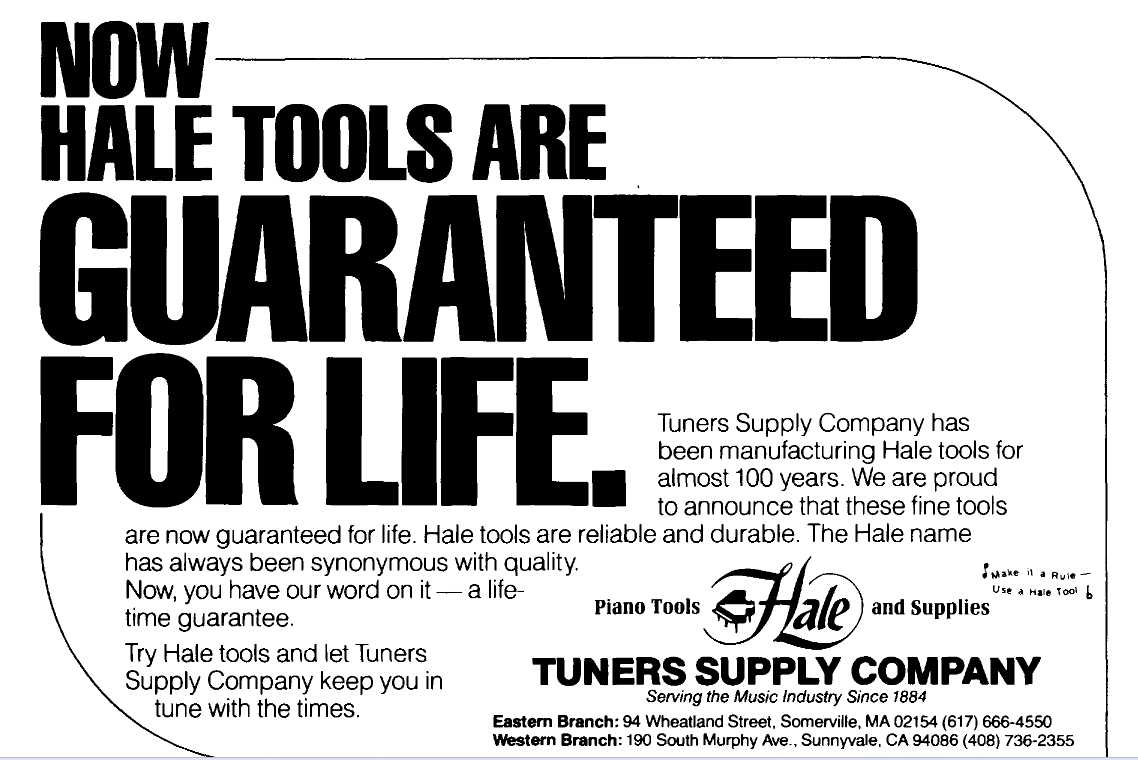 “In 1992 American Piano Supply Co. purchased the assets of Tuner’s Supply Co. of Somerville, Massachusetts. Included in the acquisition were the production equipment and the rights to use the well-known “Hale” name. APSCO stocks a large selection of tuning hammers (including the
