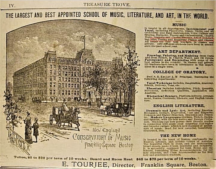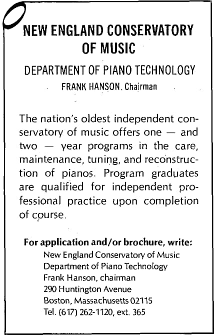 New England Conservatory of Music, Department of Piano Technology. Advertisement in “The Piano Technicians Journal,” October, 1979 (I was enrolled at the time).