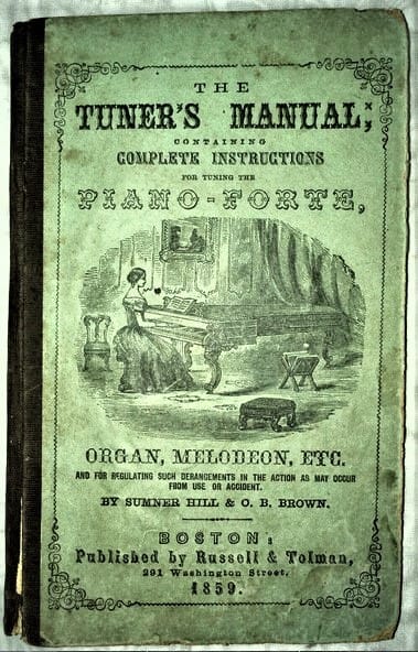 While Frank W. Hale introduced the Tenor C Temperament to his Tuning students in the late 1880s, this pattern did not originate with him, or with Faust, who taught later. The Tenor C Temperament had been circulating amongst tuners in the New England area since the 1850s, and possibly earlier. In The Tuner’s Manual, by Sumner Hill and O.B. Brown, published by Russell & Tolman, 291 Washington St., Boston, in 1859, the Tenor C Temperament was published: