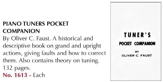 “Tuners’ Pocket Companion,” by Oliver C. Faust (1902), amazingly, still available for sale in current Schaff Piano Supply Catalogue.Faust’s Tuner’s Pocket Companion remained in print for the entire duration of the Hale/ Tuners Supply’s tenure in business (I bought my copy in 1978). It is still available today from Schaff Piano Supply, who bought out the Hale name, c. 2000.