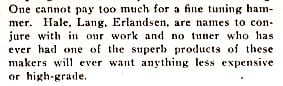 One of the very few advertisements from Hale, Tuners’ Supply, which emphasize the “Piano Makers” market. From “Tuners’ Magazine,” January, 1913.