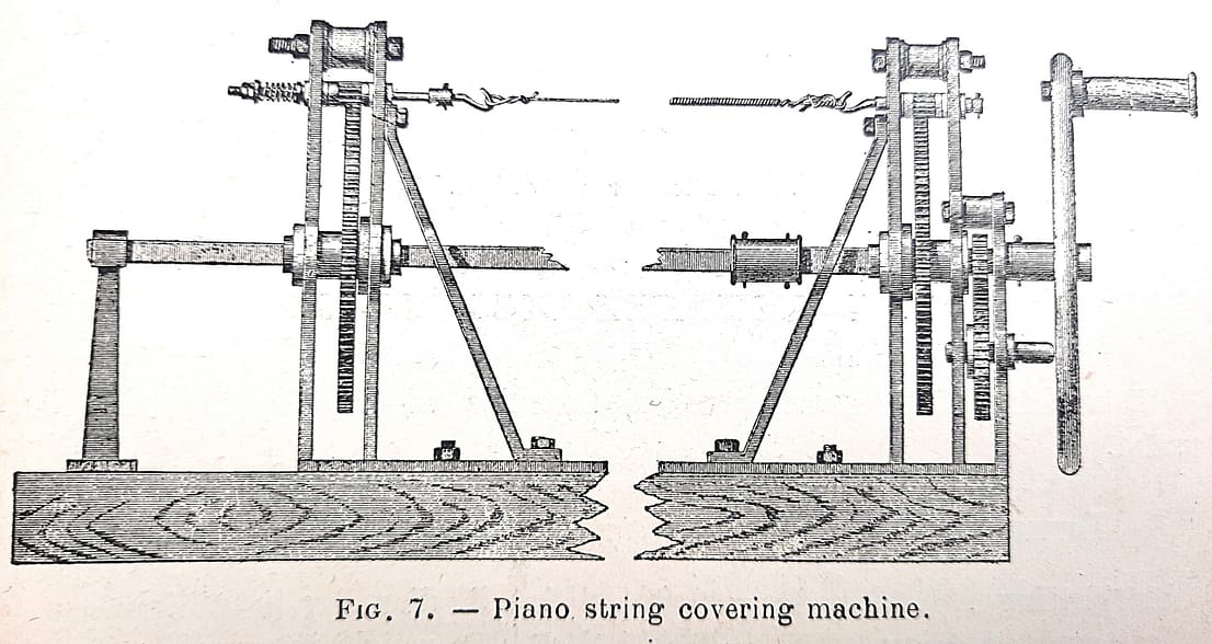 Machines were available to the industry to make bass strings of all kinds. From “The Practical Manual for the Piano and Harmonium Tuner,” Nugues, Pouget, and Martin.