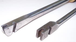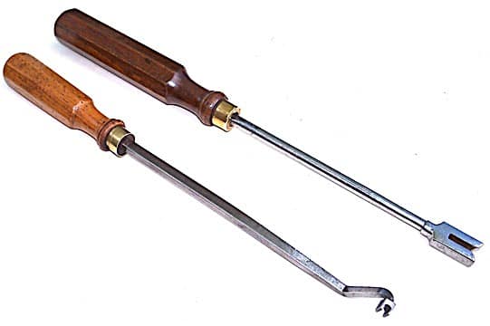 Comparison of the French wire benders and a standard H. S./ Erlandsen type. The slot at the front of the French tool is at 90 degrees, and the American type is around 70 degrees, parallel to the slot on the side. The U. S. version on the right is still sold by Schaff Piano Supply in Chicago.