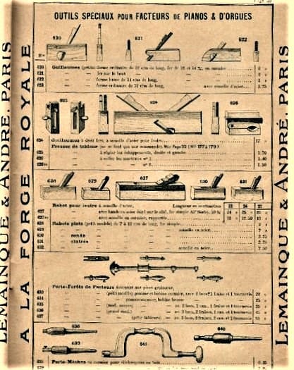 I am including some catalogue images of French Pianomakers’ Tools because the c. 1914 Pinet price list did not contain images of their products. Images of Pinet tools and supplies would have been published in a separate catalogue. Although the resolution of this 1905 Lemainque Tool Catalogue image is not great, it was old enough to still show the bow drill. Later catalogues omitted that important piano tool.