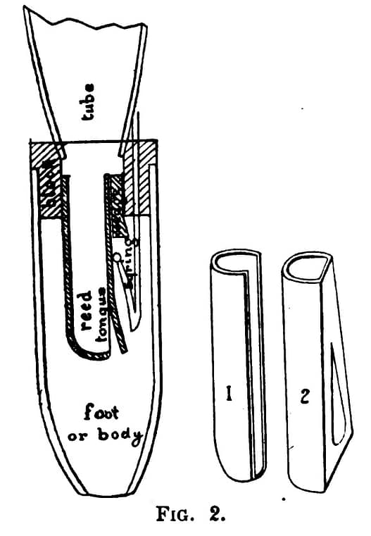 Diagram of reed, as incorporated within a French Harmonium. Image from Manuel pratique de l’accordeur de pianos et harmoniums : traitant … by E. Nugues, H.C. Pouget and Ch. Martin.