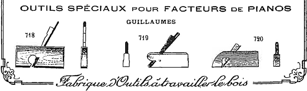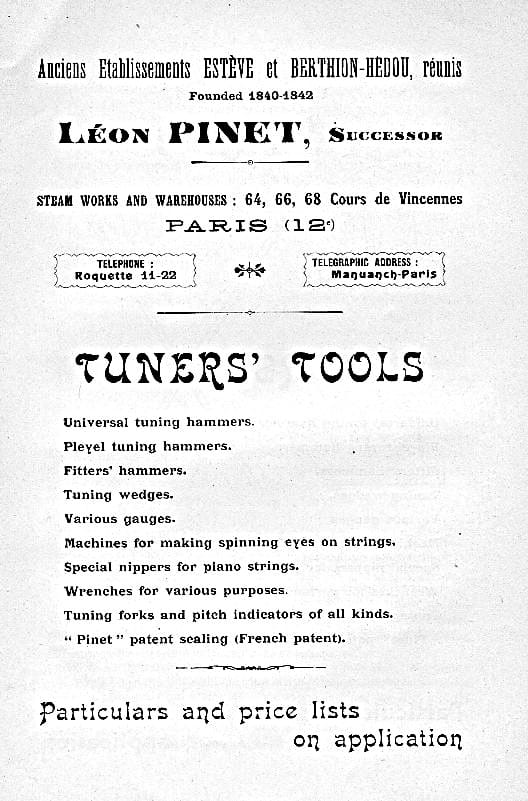 In 1880, Léon Pinet married the granddaughter of Jean Estève, and also bought the business, which became Estève et Compagnie. Léon Pinet then developed and expanded this musical instrument supply business, increasing their involvement in piano tools and supplies, and opening another branch in Belgium. A respectable time after Jean Estève passed away in 1892, the company name was changed to Léon Pinet, Paris. By 1915, Léon Pinet’s wife took over the business, which was continued unchanged.