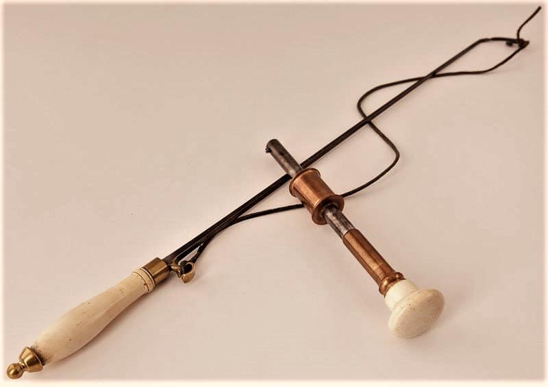 steel handle lined with ebony, 1 tapped rod, two straight tubes, long and short (nos. 418 and 419), two short ball shaped hammer heads, and two long ball shaped hammer heads.”