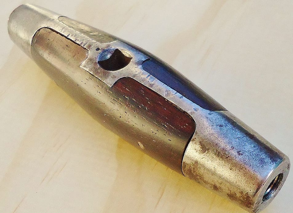 Examples of other universal tuning hammers in lever form, from top: Marque Accorda, France; Weygandt, Stuttgart, Germany; Alfred Dolge, N.Y.; unmarked, extra long, for large square pianos. Not commonly found, Universal hammers were made during the transition from the use of ‘T’ shaped hammers towards levers for tuning purposes. The Accorda and the Weygandt both contain a screwdriver inside the handle.