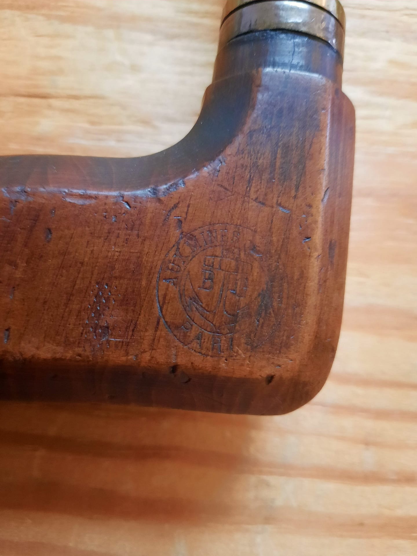 In France, the two main makers of pianomakers’ braces were Aux Mines de Suede and Mathieu, who also made pianomakers’ bow drills, which can be viewed on the Bow Drills page. French pianomakers’ braces were characterized by having an extra long neck, a stock made of cormier wood, and socket accommodating tapered bit pads. In this case the braces are in cormier wood, but the pads are a mixture of oak and ash. While the braces may look like they are ‘tipping their hats’ to each other, that’s just a distortion of the camera lens; the cormier wood handle on the left and the buffalo horn handle on the right are perfectly level. These two French braces would have been what Léon Pinet had available to buy in during his years of doing business.