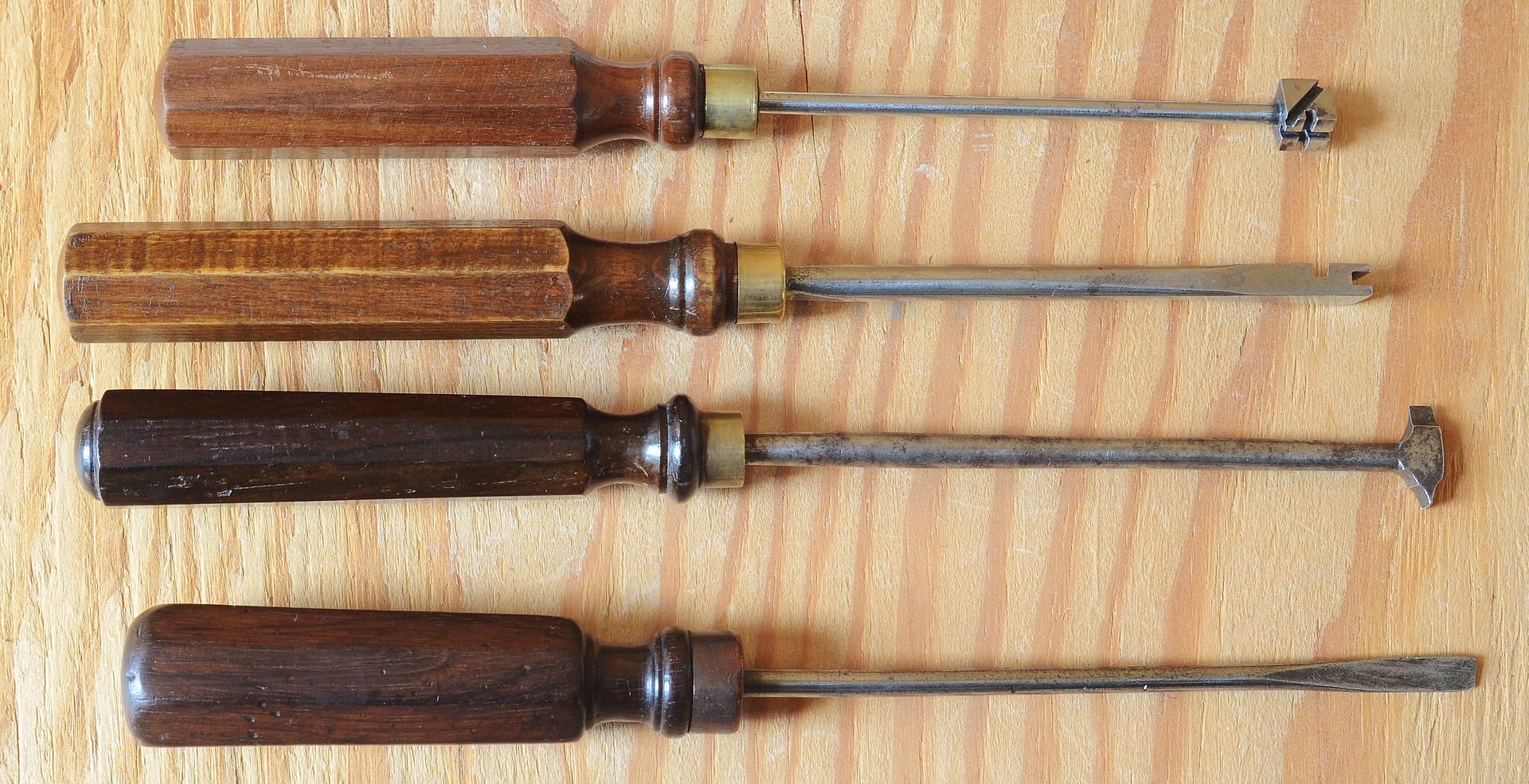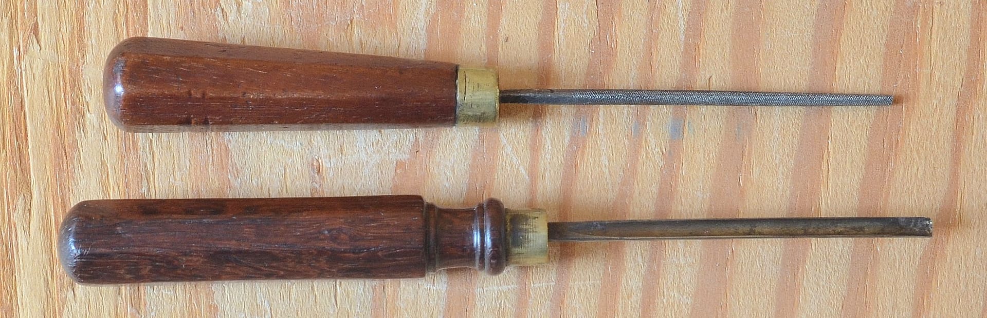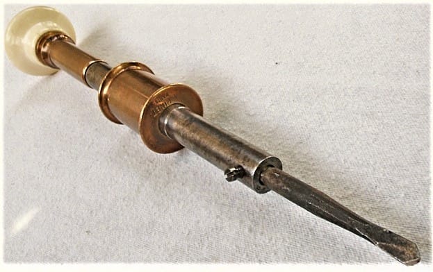 Pinet tools, with typical octagonal handles. From “The Practical Manual for the Piano and Harmonium Tuner.” From “The Practical Manual for the Piano and Harmonium Tuner.” Screwdriver, rosewood handle, bronze ferrule.