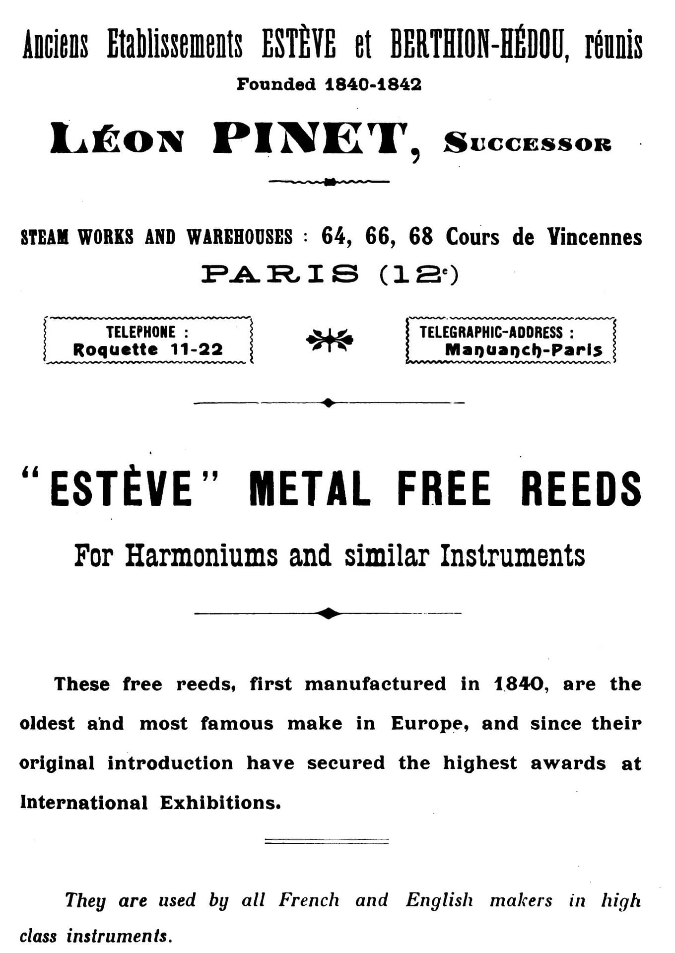 Jean Estéve, and later Léon Pinet, supplied reeds to many of the most prominent European harmonium makers, including: Mustel, Paris; Christophe and Etienne, Paris; Balthasar-Florence, Namur, Belgium; Dumont and Lelièvre, Les Andelys, France; Richard, Étrépagny and Paris; Alexandre, Ivry-Sur-Seine and Paris; Johannes Titz, Löwenberg, Germany; H. Beaucourt, Lyon, France.