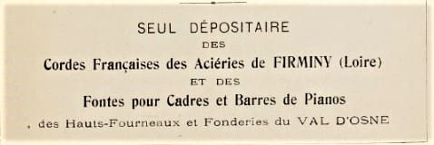 Firminy Forges. Pinet was the exclusive seller of Firminy piano strings, bars and cast plates. The town of Firminy in the Loire department was one of the largest centers for iron and steel production in France during the late 19th, early 20th centuries. A Firminy music wire gauge can be found on the String Gauges page. The smoke would not be seen as a good thing today.