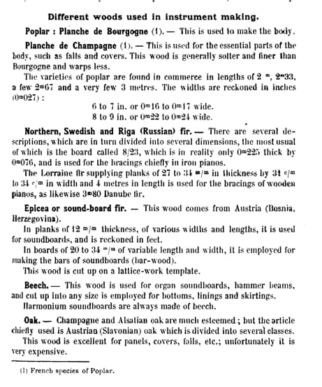 Woods used in the French piano industry, before WWI. From “The Practical Manual for the Piano and Harmonium Tuner,” Nugues, Pouget, and Martin.