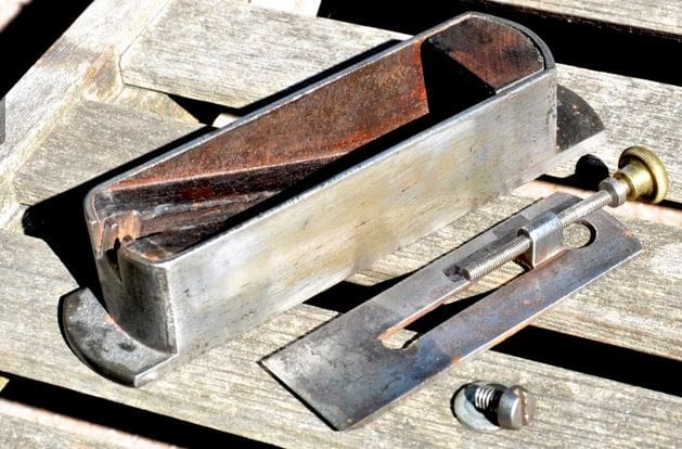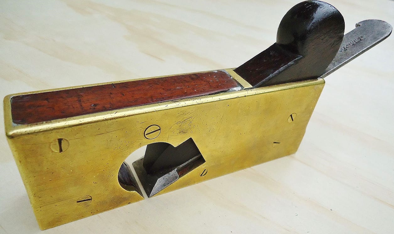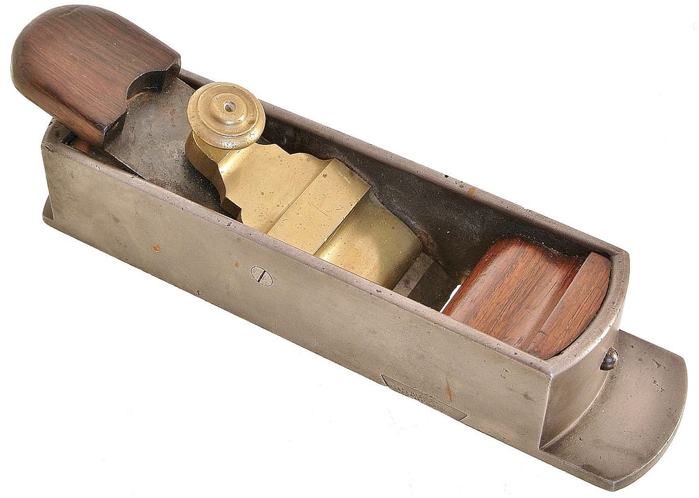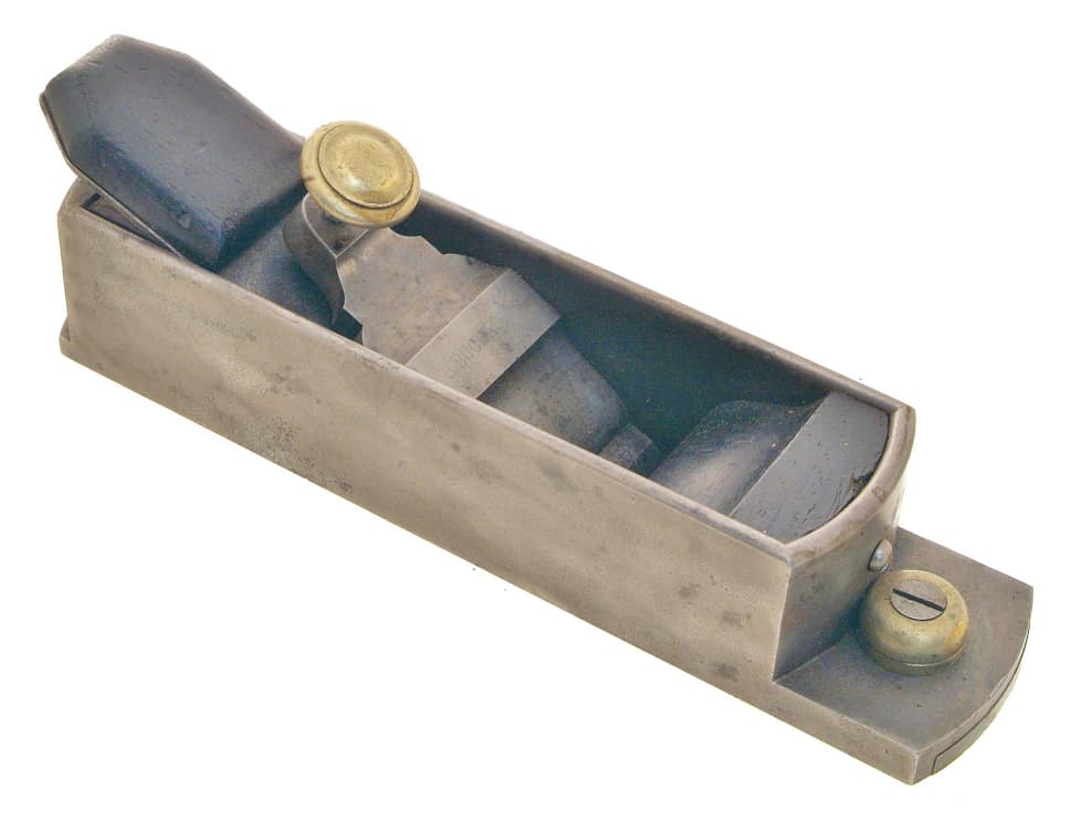 - On the right are two early nickel plated cast iron shoulder planes. Napoleon Erlandsen was the first of the New York planemakers to introduce a rabbet plane where the body was wholly cast in one piece. Even with extensive hollowed out sections above the adjustable sole, and under the cutter, these planes are heavy for their size, much more so than the Popping shoulder planes shown later on this page. Casting these planes would have required cores, which involved some extra time and expense for Erlandsen’s production. A sliding adjustable front sole piece is locked by the two screws on top, and a fine adjustment is added at the front of the planes. Both of these adjustable planes belonged to one T. Larson, and you can see that the wear marks through the plating reveal a similar hand position on each.
