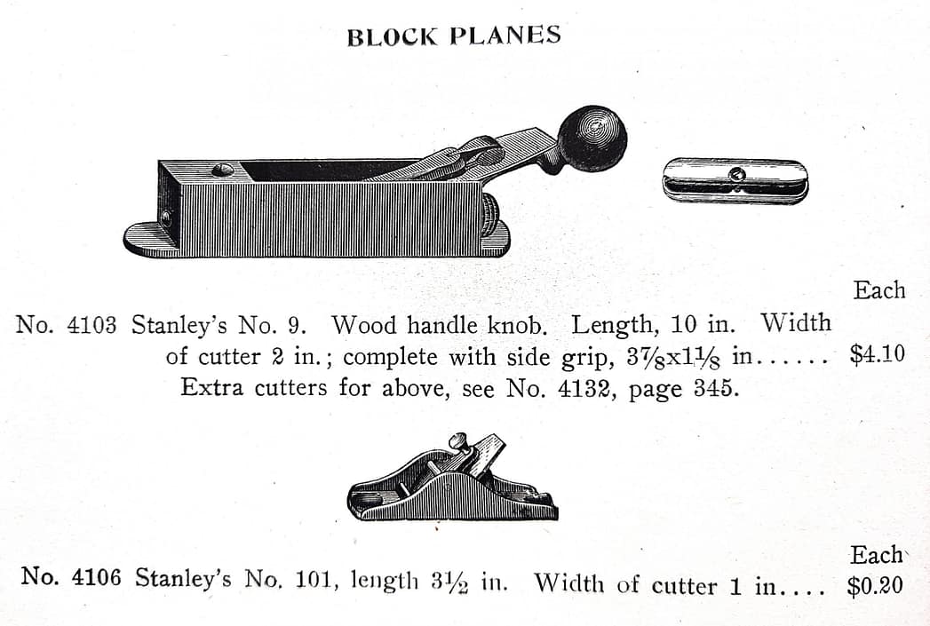 American Felt Co., 1911. Two Stanley planes, Nos. 9 and 101. The No. 9, Cabinetmaker’s block plane, was made from 1870 to 1943. This was Stanley’s version of the Erlandsen mitre plane as well as the English infill mitre planes, and this model was also used in the piano industry. A No. 9 was among the planes found in Studley’s tool chest and It included the added adjustment features which were standard in Stanley planes. Stanley No. 9’s are avidly sought by collectors–modern copies of this plane were made by Lie-Nielsen until 2013. American Felt Co.,1911, although the pictured #9 is a earlier version. An even earlier version, the Bailey No. 9, can be seen here: