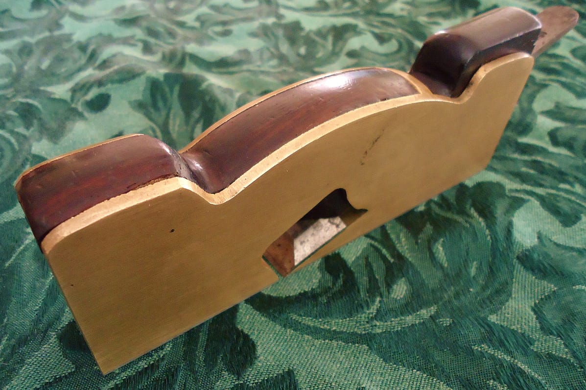 Early New York rabbet plane, download version. Another early New York pianomakers rabbet plane, this one was made from flat brass stock, which was cut, shaped and brazed together, then screwed into the mahogany infill. Ward 1-1/4″ snecked iron and rosewood wedge. Coming from a working shop, the rear infill had a small removable shim added to make up for wood shrinkage, and the consequential lower bed angle as compared to the front portion of the blade.