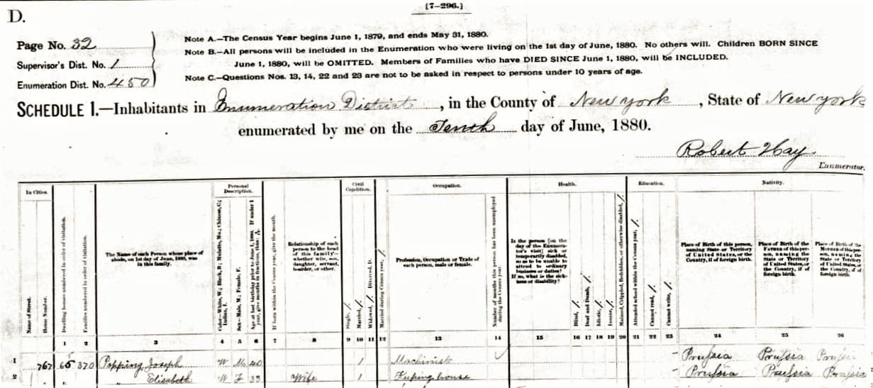 I did not find a Popping Machine shop listing in the 1882 Trow’s New York City Directory, so I would assume this is ‘our’ Joseph Popping.