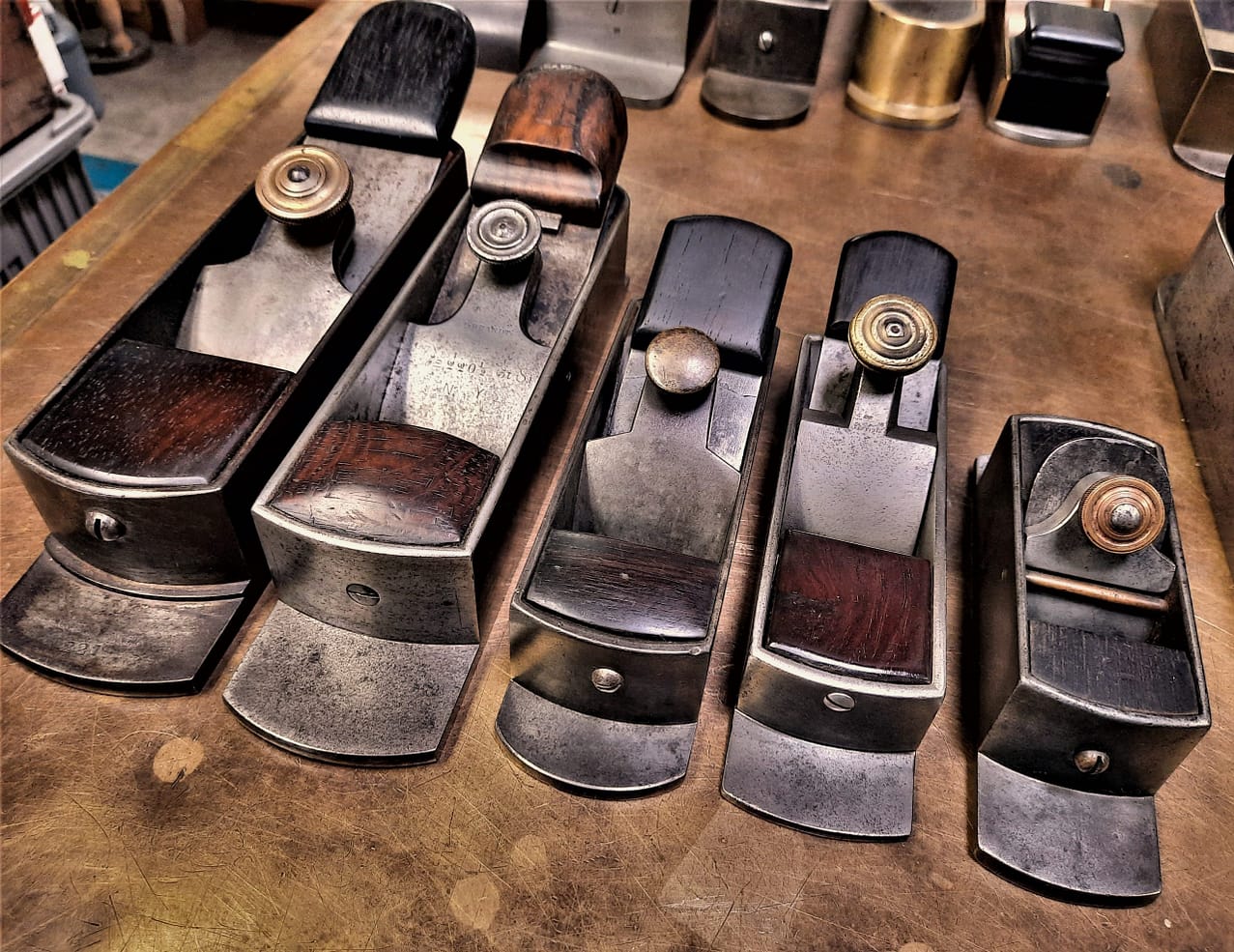 A lineup of New York mitre planes. 1. to r.: Erlandsen; Brandt; Brandt; Thorested; 3″ bevel down mini-smoother. From James Claussen collection.