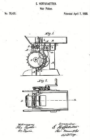 Hoffstaetter’s Hair Picking Machine, manufactured by Joseph Popping. Hoffstaetter’s Patent Hair Picking machine was used to pick through and sort out horse hair used in 18th and 19th century upholstery. There is still a horsehair picking machine in the House of Representatives for periodic “refluffing” of the horsehair stuffing in the resident collection of antique furniture.
