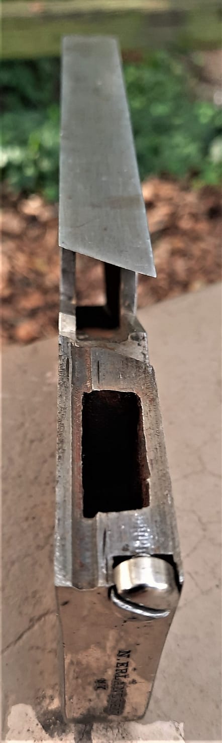 Erlandsen’s complex casting showing two hollow sections. Expensive to producErlandsen’s complex rabbet planes had two hollow sections. The rectangular opening in the foreground leads to a void extending to the screw holes at the top of the plane. Expensive to produce, with a Patternmaker’s time and labor, involving the use of molds and cores.