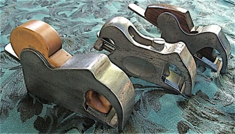 Three dovetailed steel English box mitre planes, generally these designs served as examples which influenced Bailey and Erlandsen. All three planes have fine non-adjustable mouths, especially the Moseley and the Spiers. On average, these English planes have smaller throats than either the Stanley No. 9 or the New York piano planes when adjusted to their narrowest aperture. There are notable exceptions, however.