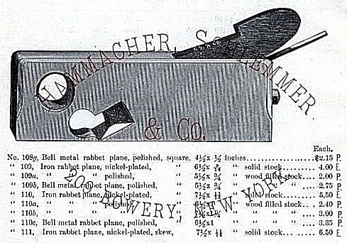 Erlandsen rabbet planes with fixed mouths, and available in six choices, as shown in the Jan. 1, 1885, Hammacher Schlemmer catalog. This was a cast iron model with a finger hole to balance the weight as well as to give another way to help grasp the plane while working. It was surely a simpler way to lighten and balance the plane as compared to the extensive internal hollowing out done on the earlier cast iron rabbets. This 1885 catalog entry reveals that this model was introduced almost a decade earlier than what has been generally thought.