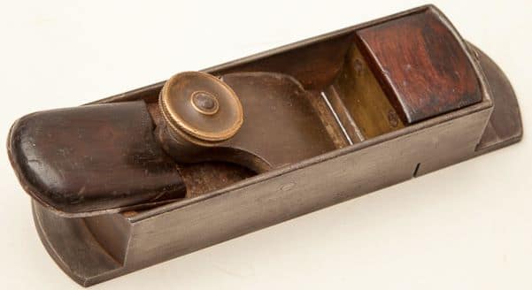 The rosewood plane (l.), with a steel sole and a double iron was user made. The plane in the upper right has a strongly compassed, or convex, bottom.