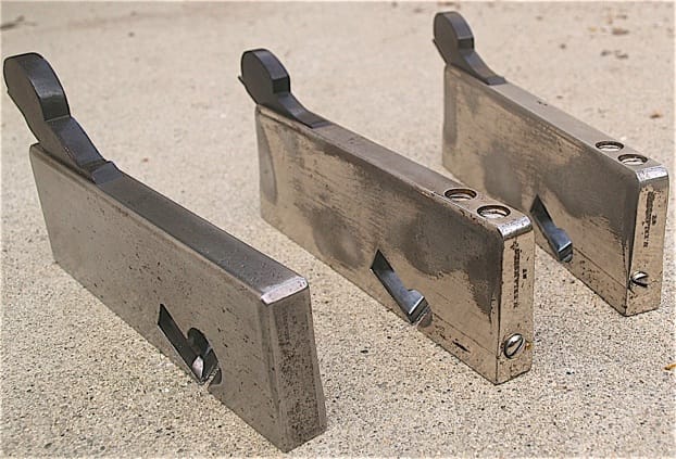 Three adjustable fron sole pieces: l. Stanley No. 9; Erlandsen; Popping. The throat was made to be adjusted by a single screw at the top of the