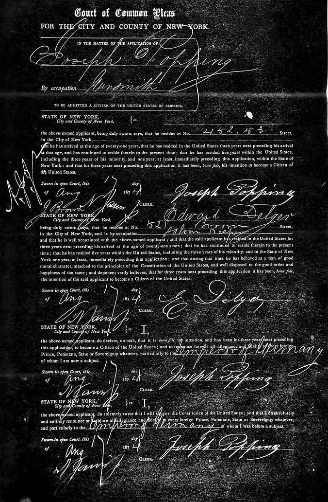 Naturalization of Joseph Popping, Gunsmith, on 17 August, 1874.In 1869, Joseph Popping emigrated from Prussia to New York, married his wife Elizabeth Strunck (b.1850) on 6 October, 1872, and became a naturalized U.S. citizen on 17 August, 1874. Popping’s machine shop operations were established in 1873 and curtailed in late 1903 as shown by the New York City directories. His machine shop addresses were as follows: 55 West Broadway (1873–1874); No entries found for 1875–1879; 767 9th Ave. (1880–1881); 433 West 56th St. (1881–1883); N.E. Corner 11th Ave. x 58th St. (854 11th Ave.) 1884-1894>; 806 11th Ave. (<1897–1902). The 1900 US census revealed that Popping was still working, although “unemployed” for two months out of that year, so business was either slowing down or Popping took time off for personal or health reasons. Joseph and Elizabeth, his wife, rented their home. The 1905 New York state census showed that Joseph Popping, 63, was living “at home,” which in the terms of the census, meant that he was retired. Joseph Popping’s death certificate revealed that he died in Manhattan on November 27, 1906, at the age of 64.