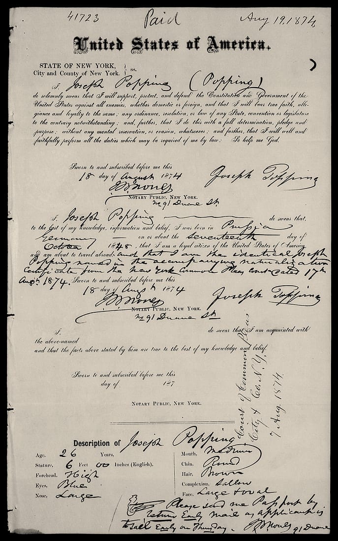 “Please send me Passport by early return mail as applicant will sail early on Thursday.” –J. Mones Public Notary, 91 Duane St., N.Y.C. Since there were no documents in New York City for Joseph Popping between 1875 and 1877, I would assume Popping was living back in Prussia for those years.