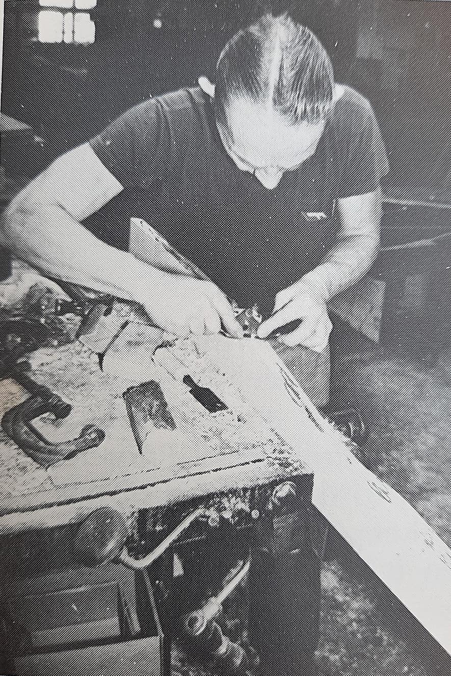 Andrew J. Boisvert (March 22, 1917- April 22, 1991) using a spokeshave for final shaping/fitting of a pinblock to the plate flange in a new Knabe grand. This was in the Aeolian American factory in Rochester, N.Y. during the mid-1970s. Spokeshaves have an angled cutter like a plane, rather than set at 90 degrees with the edge curled over as in the scrapers seen above. Close at hand is a chisel and a bit brace, which are also used in this procedure.