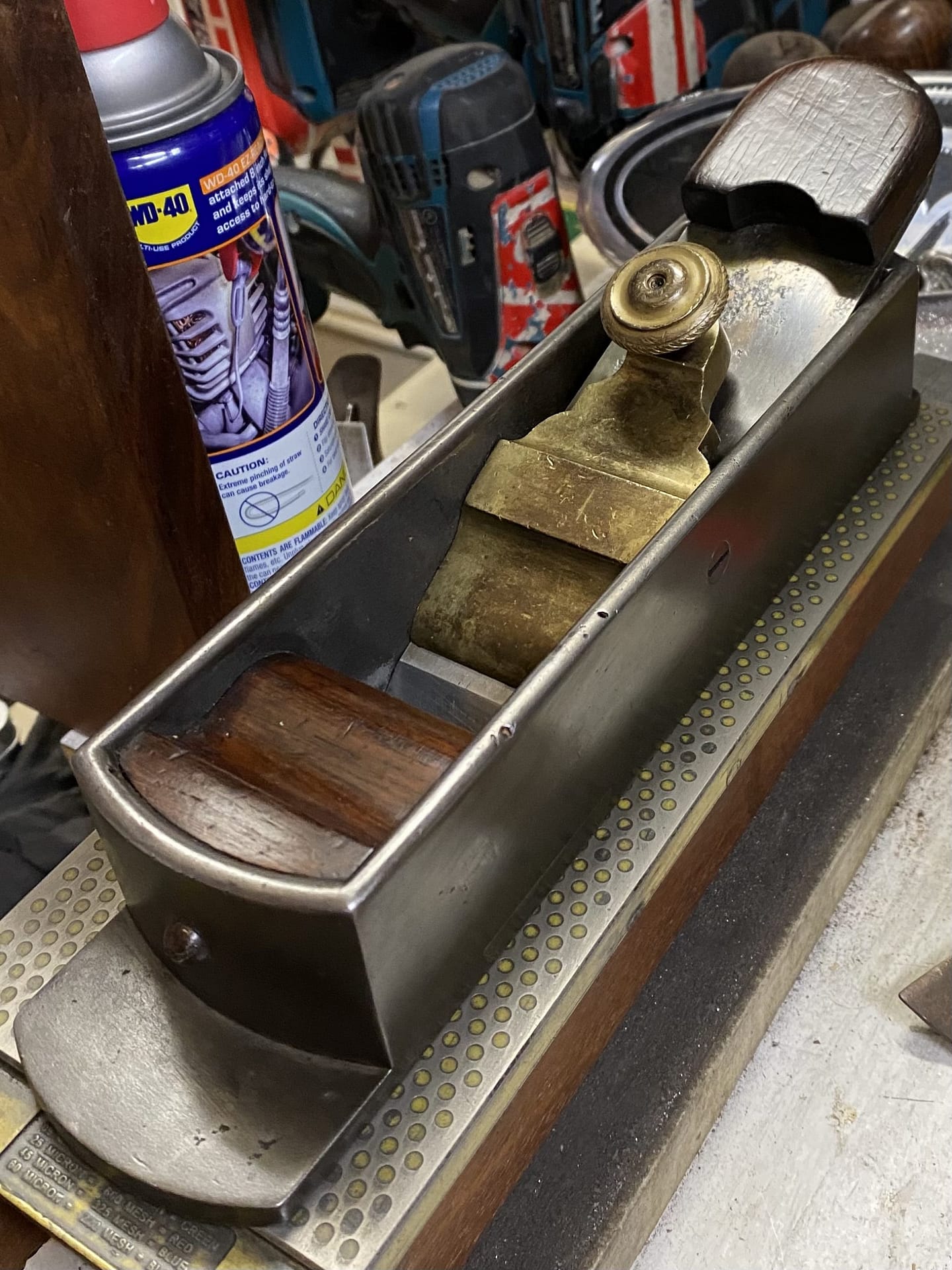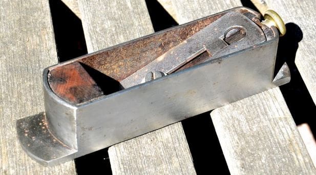 Mitre/Rabbet plane. Photo from Ebay, December 2017. New York style design, with adjustable mouth. English badger/rabbet/mitre planes exist, but this example may be a one-off.
