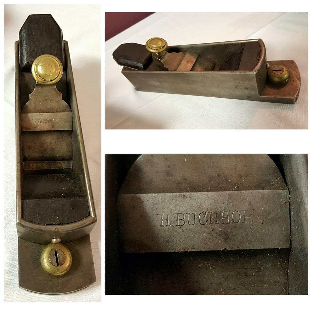 A FANCY CABINET MAKERS MITRE PLANE by Henry Buchhop, New York, New York. This plane is nicely appointed with a brass locking screw for the cap and a rounded brass washer to secure the throat adjustment. It retains its full cutting iron by Shepherd Brothers and and is in excellent collector quality condition. Henry Buchhop was listed as a cabinetmaker in the 1867 New York City Directory, living at 133 Sixth Avenue. In 1872, he was listed at 147 Avenue A. In 1878 he had moved to 458 W. 50th Street, where he worked as a cabinetmaker. He worked as a cabinetmaker in New York City throughout his life. The plane is marked with the designation “H. Buchhop” on the bridge. Its unique configuration suggests that Buchhop may have made it himself.” Martin Donelley auctions, April 2016.