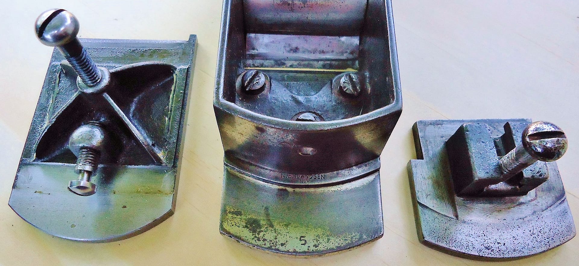Three adjustable fron sole pieces: l. Stanley No. 9; Erlandsen; Popping. The throat was made to be adjusted by a single screw at the top of the