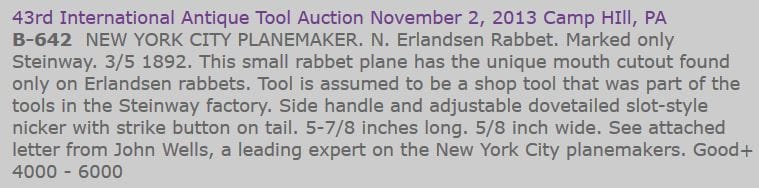 Erlandsen rabbet plane in the Nov. 2, 2013 Brown Auction. Marked Steinway, and probably a custom order, with a side handle and nicker, both of which are features not typical of the standard Erlandsen rabbet planes.