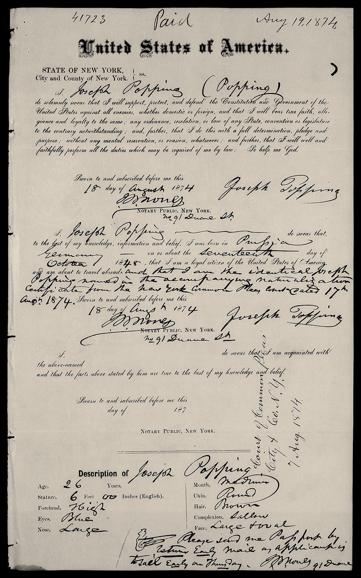 “Please send me Passport by early return mail as applicant will sail early on Thursday.” –J. Mones Public Notary, 91 Duane St., N.Y.C. Since there were no documents in New York City for Joseph Popping between 1875 and 1877, I would assume Popping was living back in Prussia for those years.