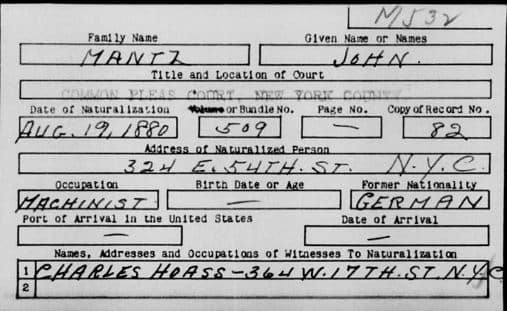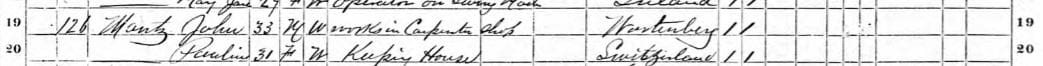 1870 U.S. census for John Mantz. While N.Y.C. city directories from the 1870s to the early 1890s list Mantz as either “machinist” or “engineer,” this John Mantz was working in a Carpenter’s shop in 1870.
