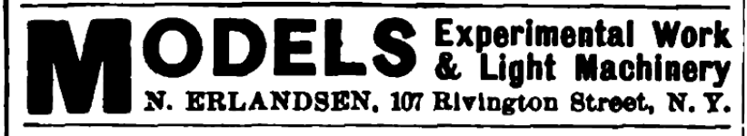 Napoleon Erlandsen advertisement for Models and Experimental work, in the “Scientific American” May 11, 1889. 107 Rivington St.
