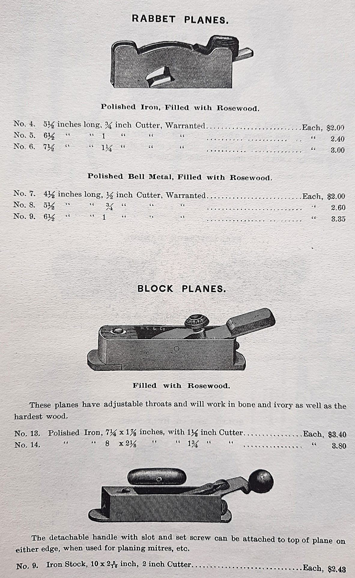 Erlandsen rabbet planes with fixed mouths, and available in six choices, as shown in the Jan. 1, 1885, Hammacher Schlemmer catalog. This was a cast iron model with a finger hole to balance the weight as well as to give another way to help grasp the plane while working. It was surely a simpler way to lighten and balance the plane as compared to the extensive internal hollowing out done on the earlier cast iron rabbets. This 1885 catalog entry reveals that this model was introduced almost a decade earlier than what has been generally thought.