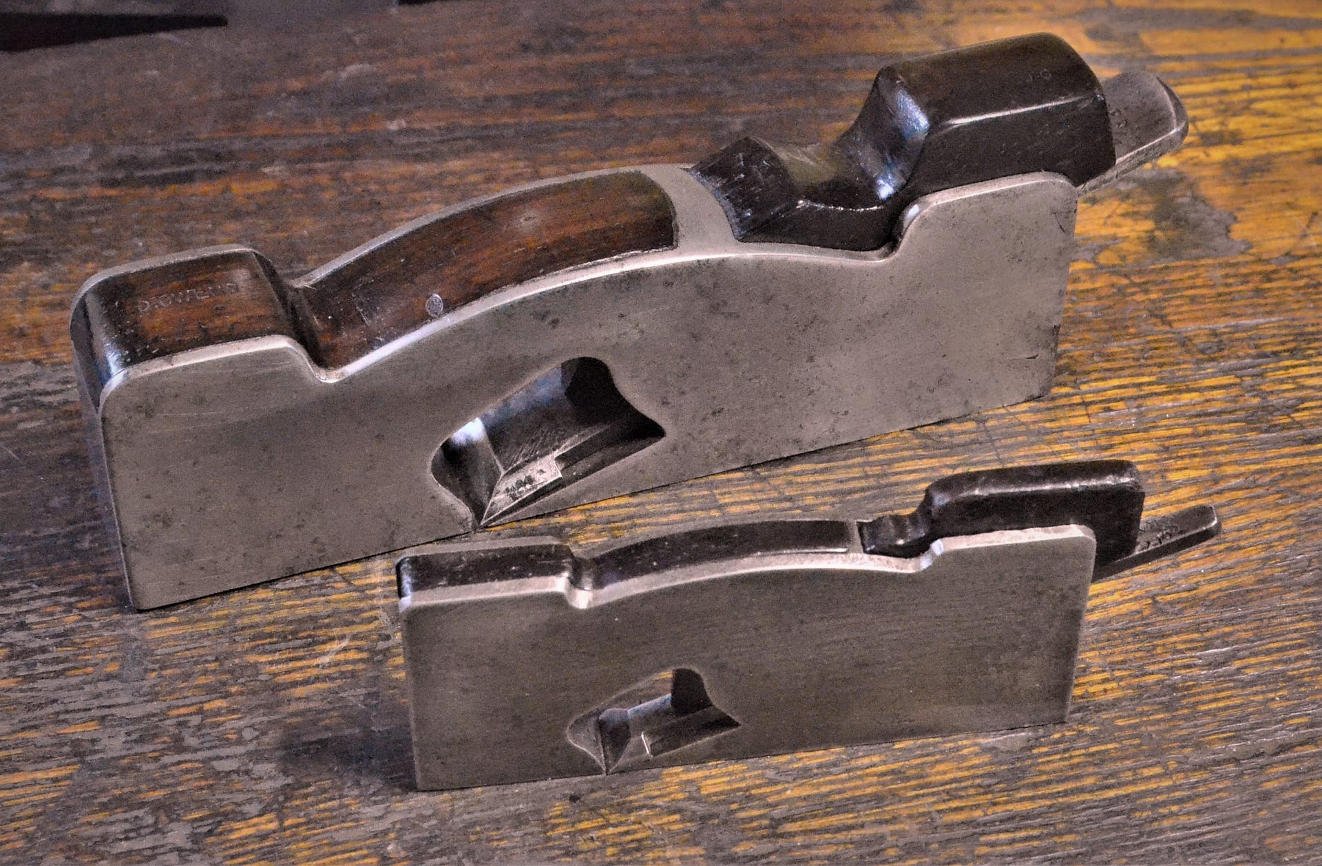 - On the right are two early nickel plated cast iron shoulder planes. Napoleon Erlandsen was the first of the New York planemakers to introduce a rabbet plane where the body was wholly cast in one piece. Even with extensive hollowed out sections above the adjustable sole, and under the cutter, these planes are heavy for their size, much more so than the Popping shoulder planes shown later on this page. Casting these planes would have required cores, which involved some extra time and expense for Erlandsen’s production. A sliding adjustable front sole piece is locked by the two screws on top, and a fine adjustment is added at the front of the planes. Both of these adjustable planes belonged to one T. Larson, and you can see that the wear marks through the plating reveal a similar hand position on each.