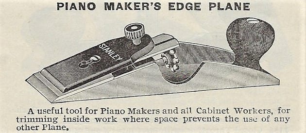 Stanley finger planes, numbers 100 and 10Stanley finger plane No. 101, made from 1877 to 1962. This very small plane was included in most of the piano supply catalogs between 1885 and 1940, because it was small, useful for a number of repairs, and could easily fit into a mobile tuner’s kit. These detail planes were used to remove wood in situations where today, sanding or filing would be more commonplace. This Stanley 100 with the squirrel tail tote was made in the 1930s, and the #101 in the foreground has the early Stanley inscription, which would date it to 1877–1884.