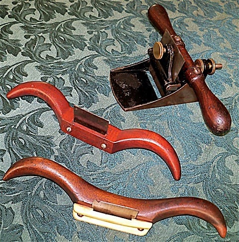 These tools belonged to a Swedish cabinet maker who worked in the veneer department of a Boston piano factory in the early 1900s to the late 1920s. He dated many of his tools, and the Stanley #12 veneer scraper is stamped 1907 on the handle. These two mahogany ram’s horn scraper shaves were user made, probably by himself, and very well executed. His blades were made from an old saw, and the sole and blade holder of the one in the foreground was cut from bone, looking similar to ivory, making this a beautiful tool. Fine scraping was an older, standard method for creating a smooth surface on veneer, instead of sanding, which left the wood pores more open and free of sawdust, as well as being easier on the lungs. Veneer was a good 1/16″ thick then; most new pianos today have thinner, even paper-thin veneer coated with a thick layer of polyester resin