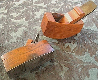 The rosewood plane (l.), with a steel sole and a double iron was user made. The plane in the upper right has a strongly compassed, or convex, bottom.