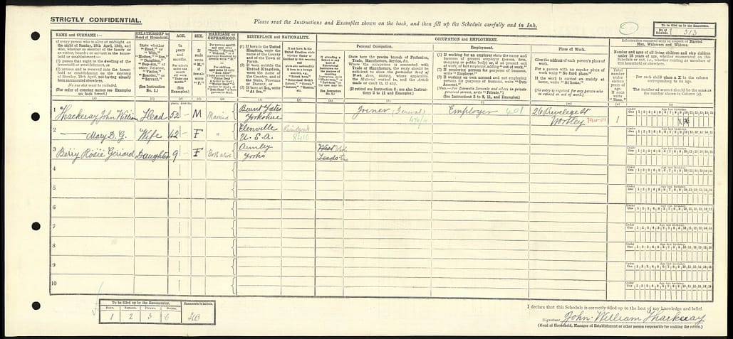 J. W. Thackeray in the 1901 U.K. census, 5 Elizabeth St. Armsley, Leeds. John W. Thackeray, was listed as a “Carpenter; Employer,” with wife Jane A. and son Fred, 3.