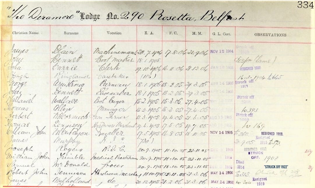 James Mulholland and Robert John Dennison, Hardware Merchants, joined The Deramore Lodge, at 290 Rosetta, Belfast, on 14 May, 1906.